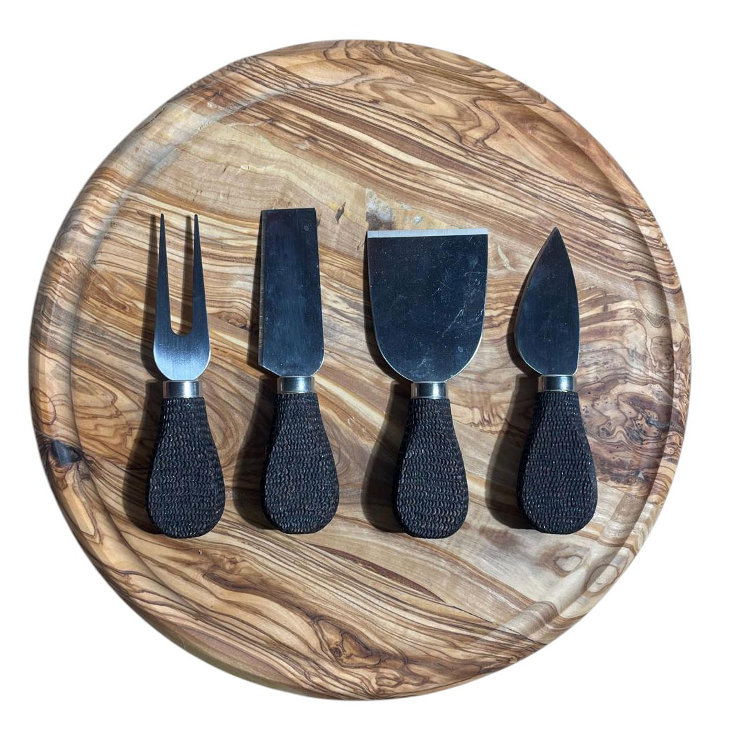 4 adet sapları dağlama kalemiyle yakılarak işlenmiş çelik peynir bıçağı.