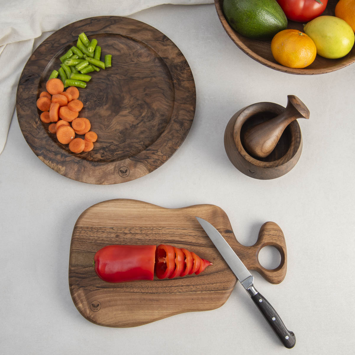 Biz de bu koleksiyonu, 1. sınıf ceviz ağacını doğal yollarla kurutup, incelikle işleyip, zarif sofra ve mutfak ürünlerine dönüştürerek oluşturduk.