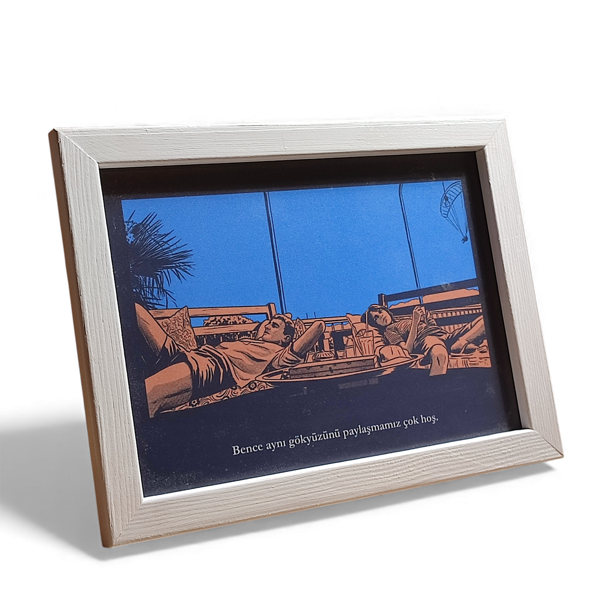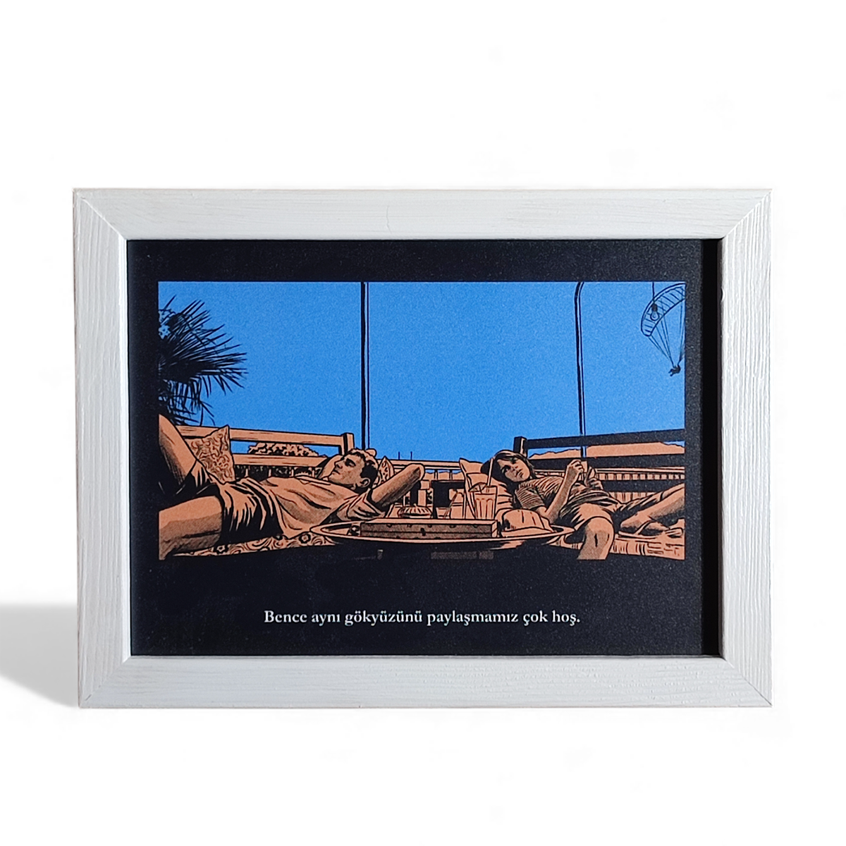 Sahnenin altına filmden seçilen replik yazılmıştır; “Bence aynı gökyüzünü paylaşmamız çok hoş”