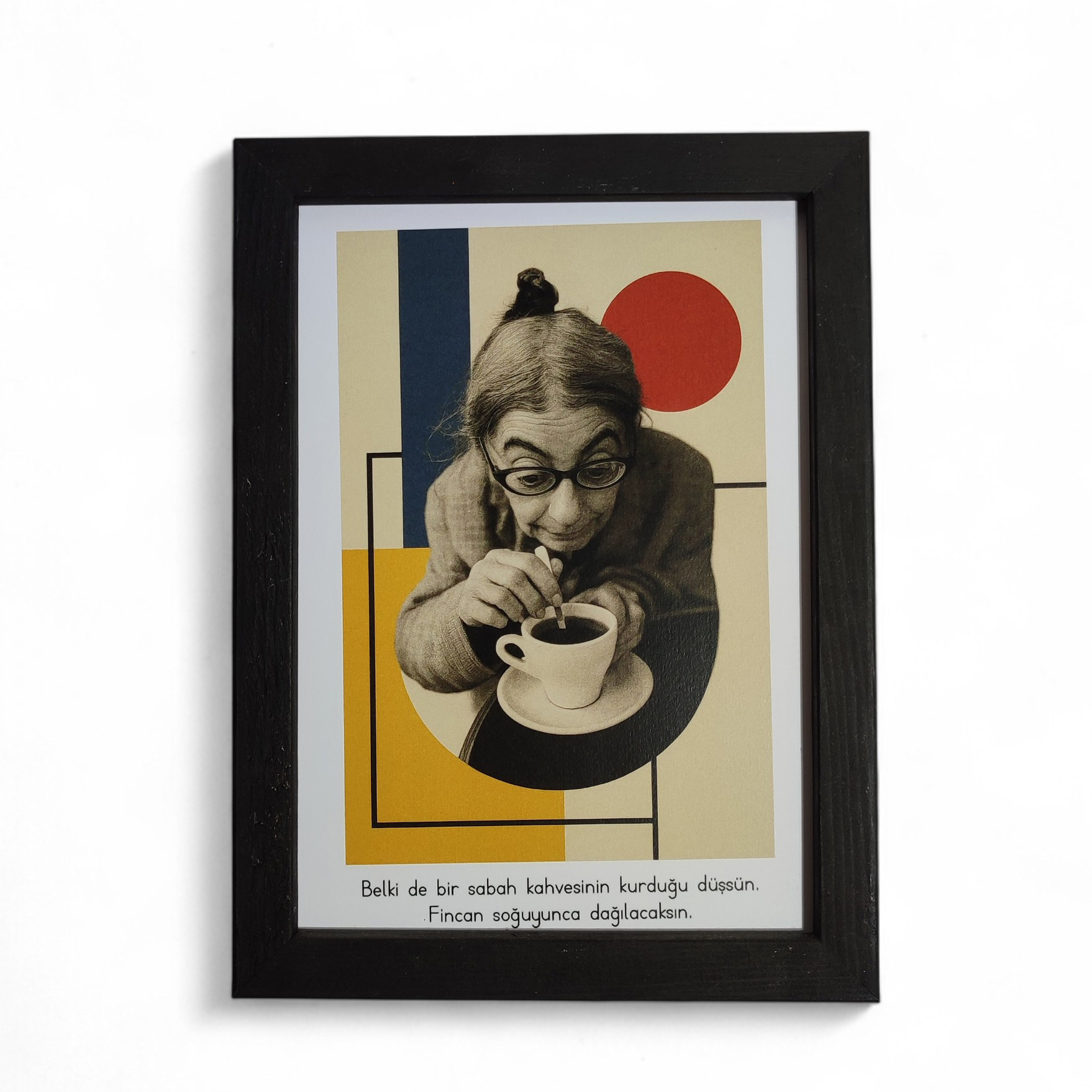 Siyah-beyaz fotoğrafın fonu Mondrian tarzında dönüştürülmüş ve fotoğrafın altına “Belki de sabah kahvesinin kurduğu bir düşsün. Fincan soğuyunca dağılacaksın.” sözü yazılmıştır.