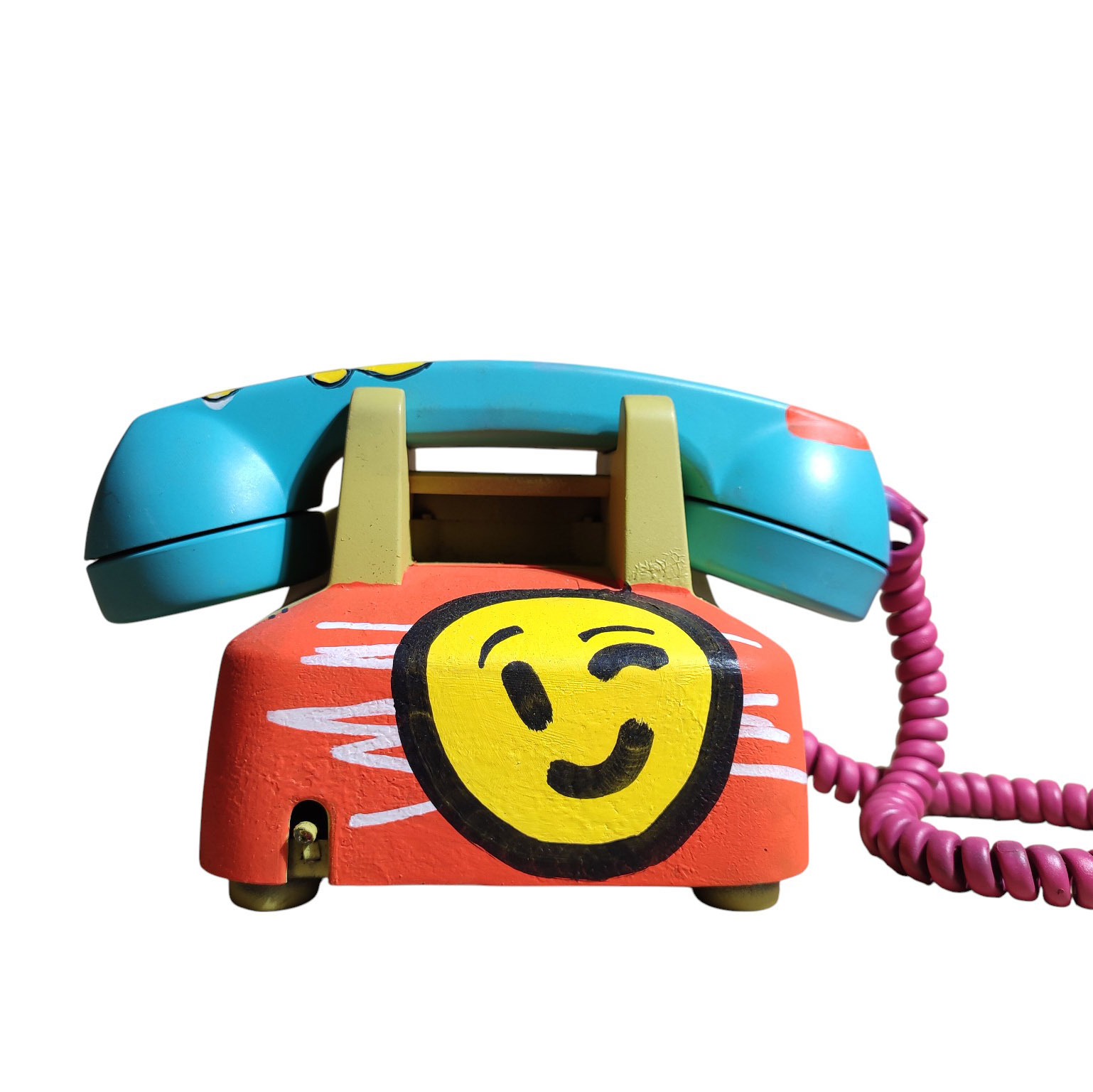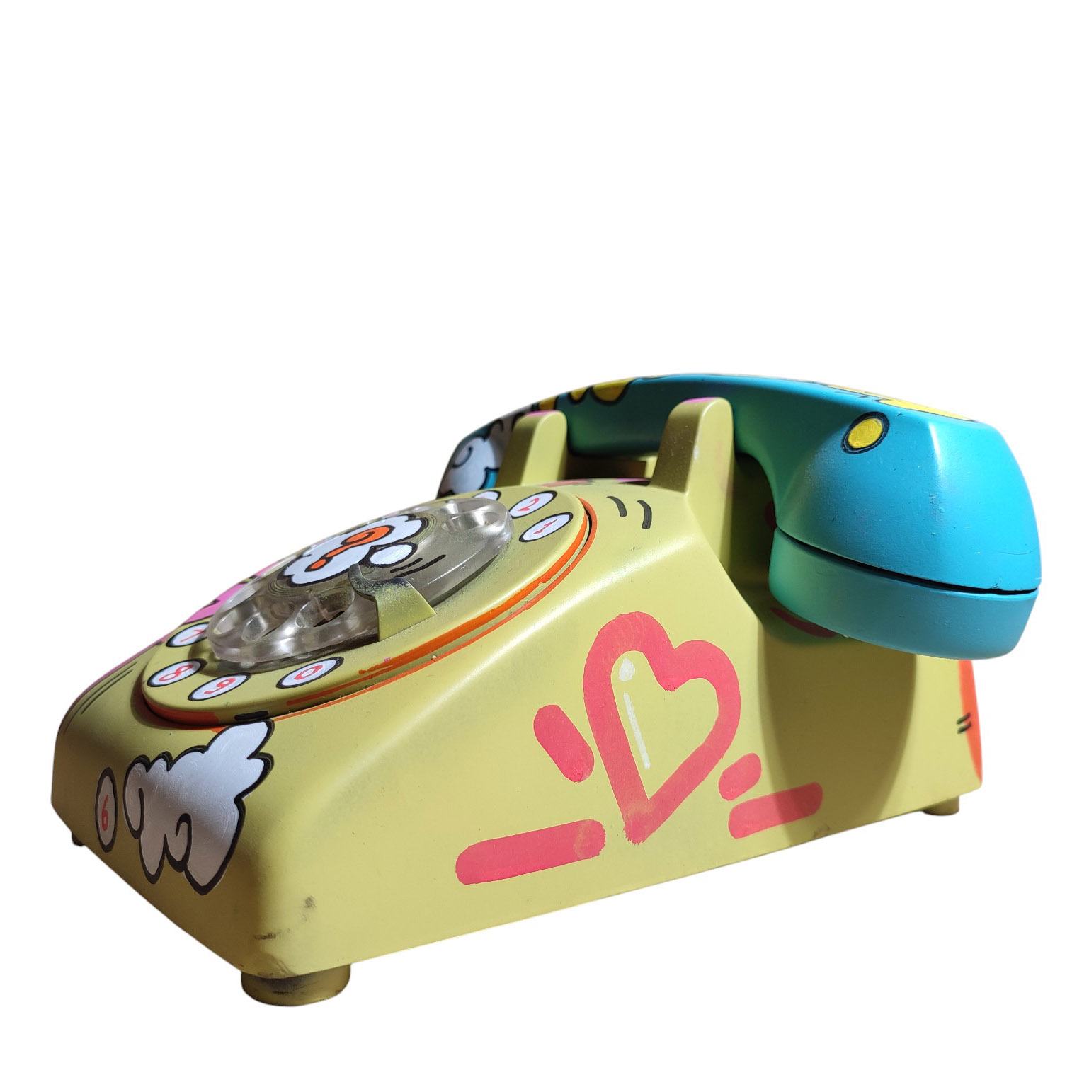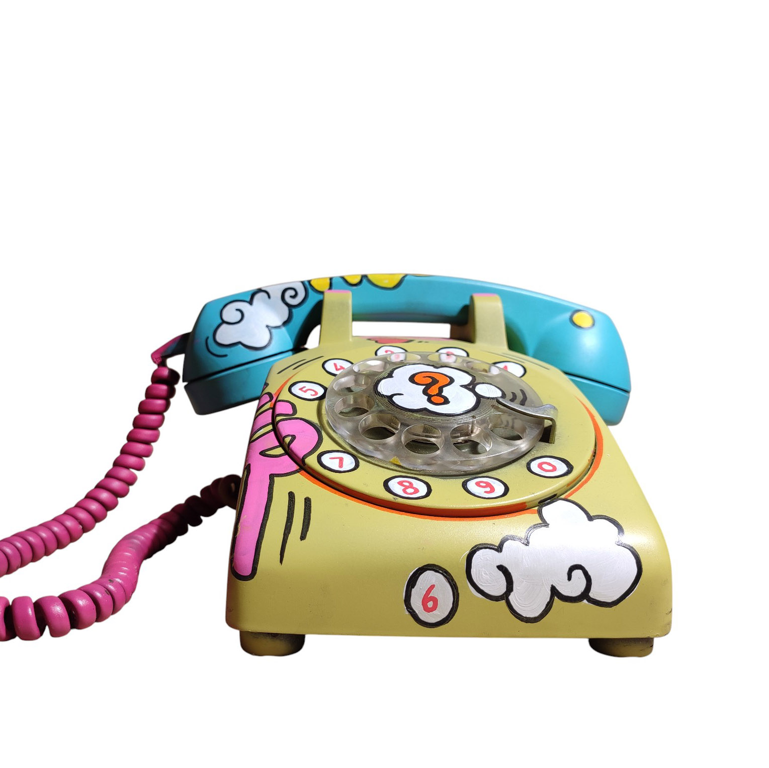Orijinal antika çevirmeli telefon zımparalanmış, boyanmış ve çizim yapılmıştır.