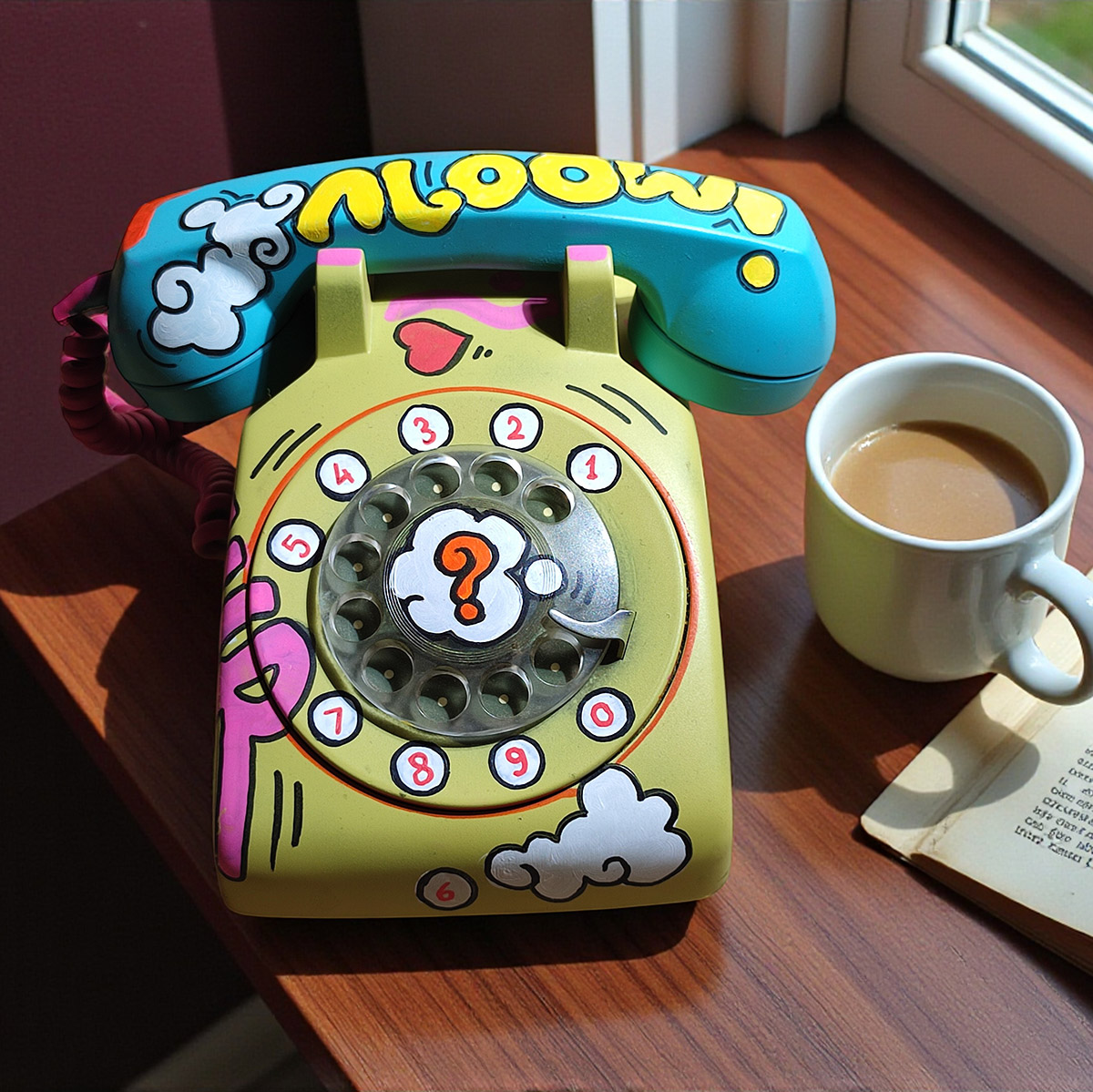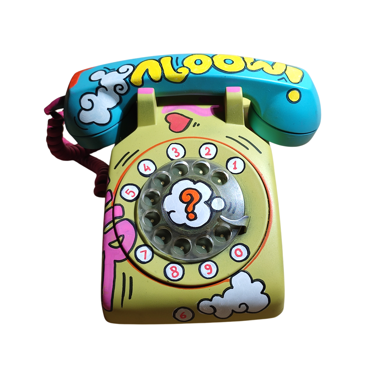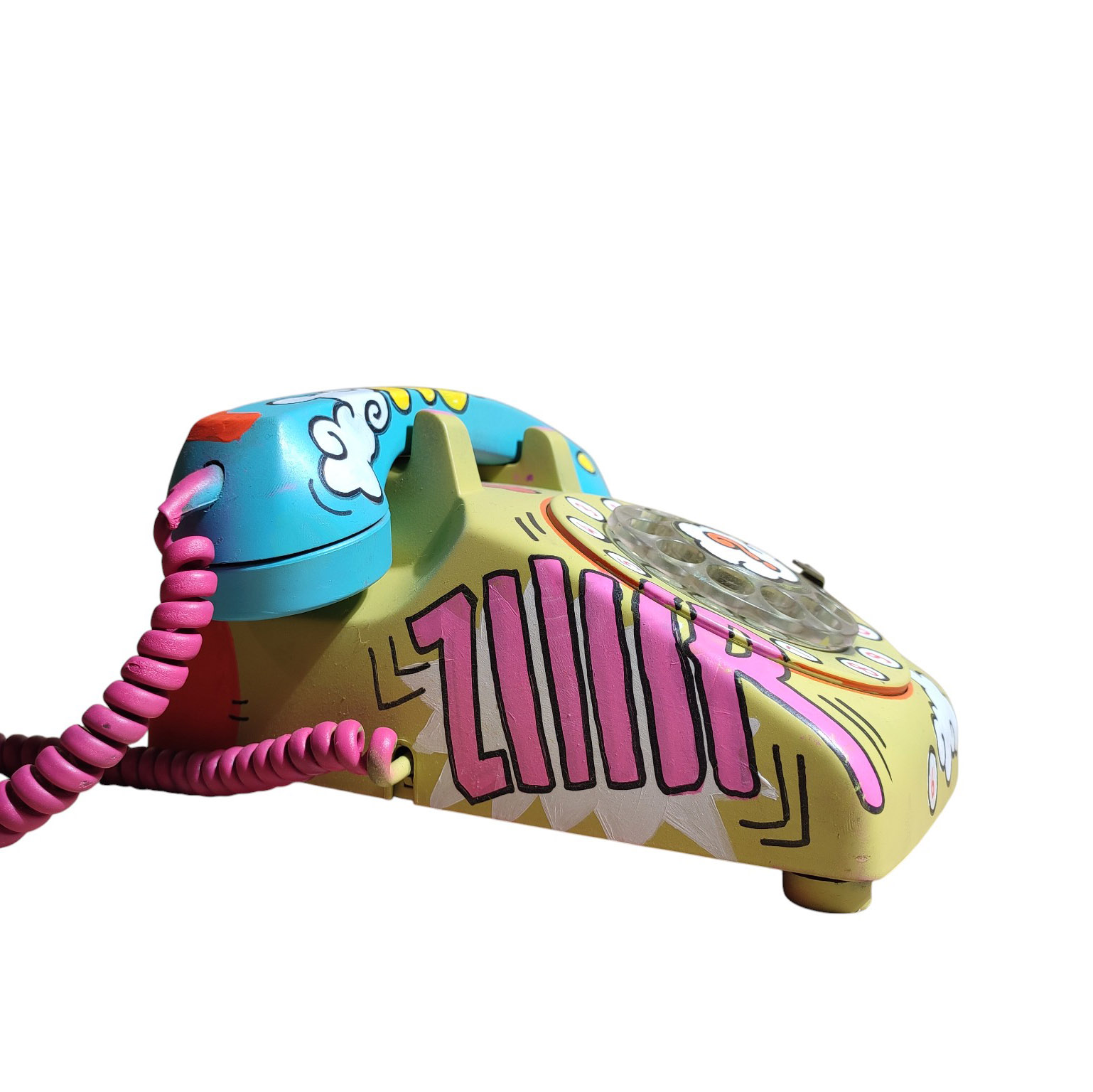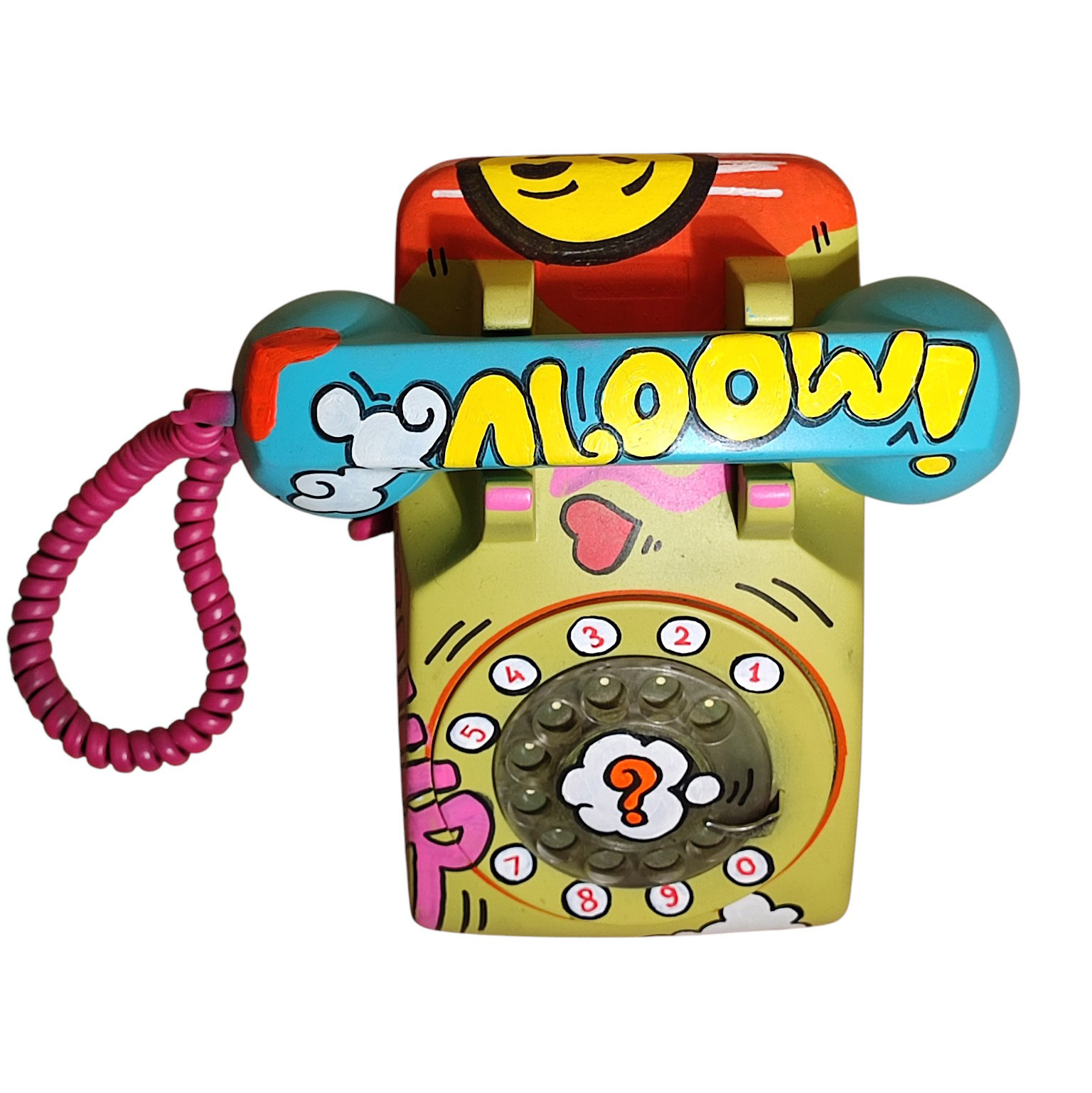 Orijinal antika çevirmeli telefon zımparalanmış, boyanmış ve çizim yapılmıştır.