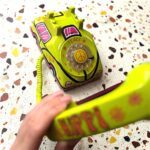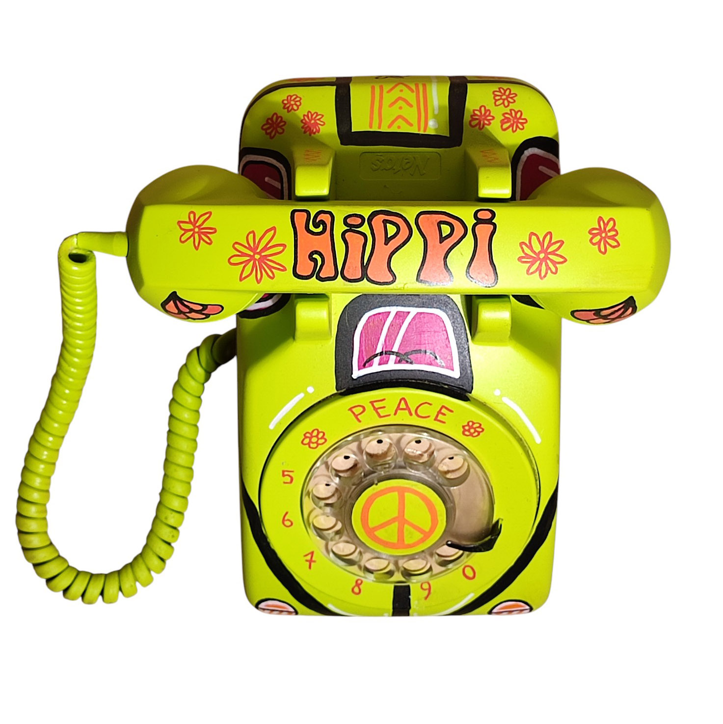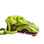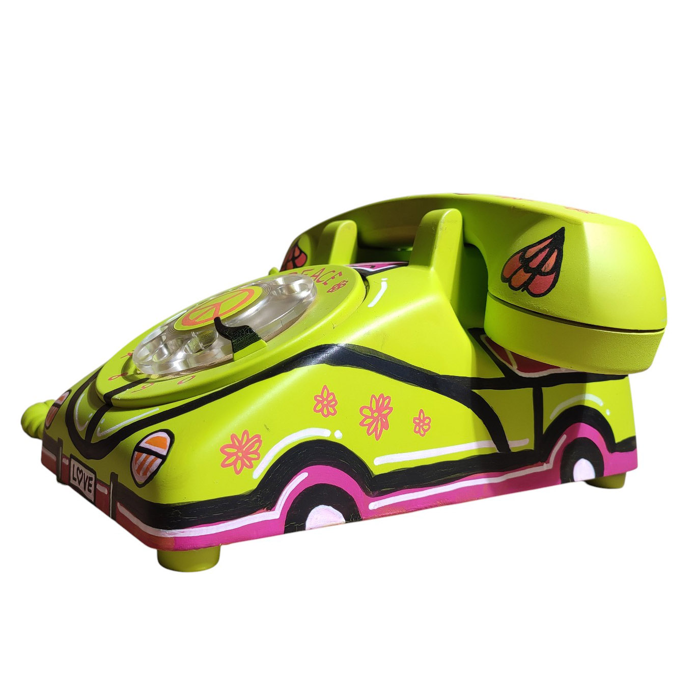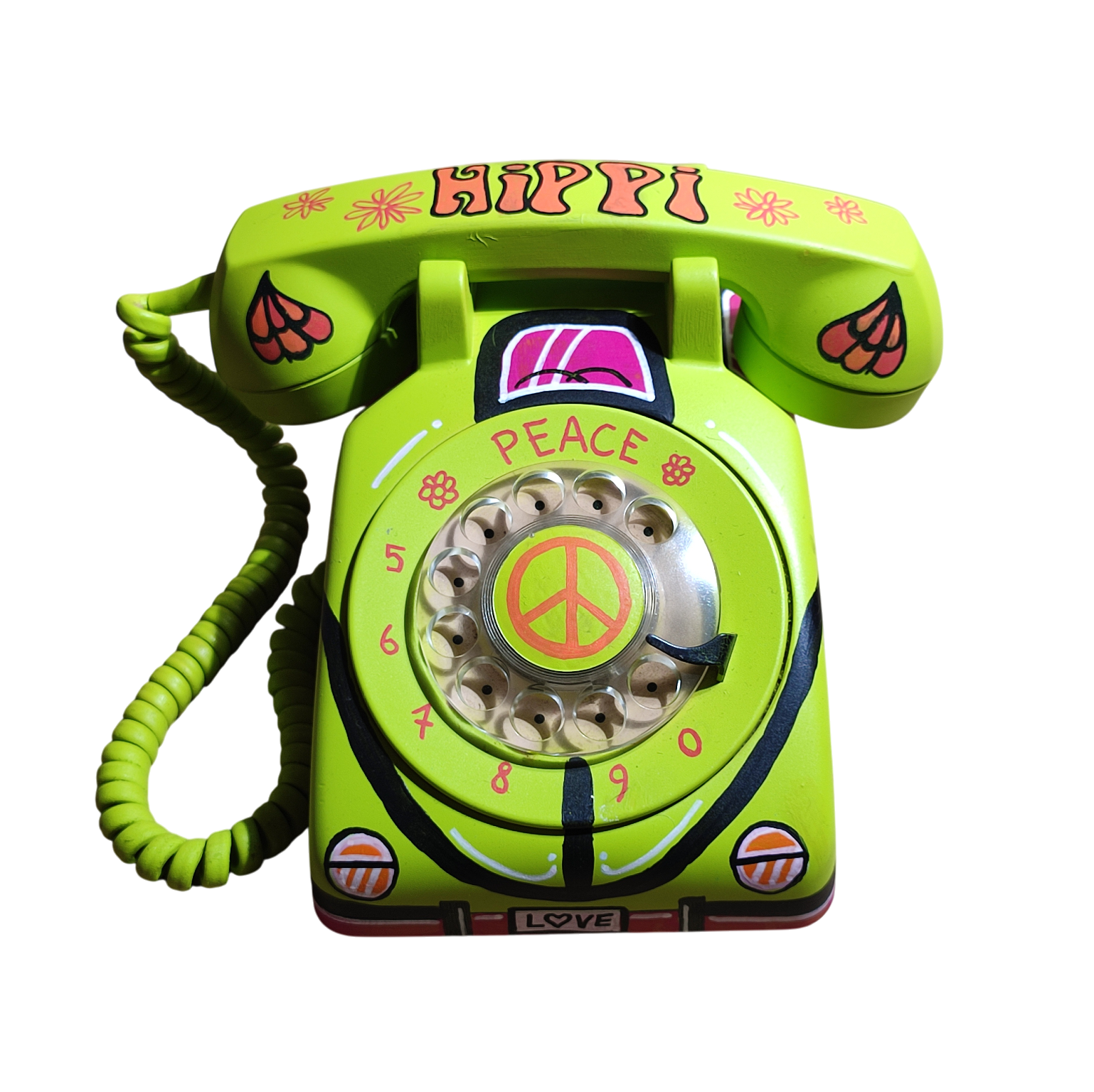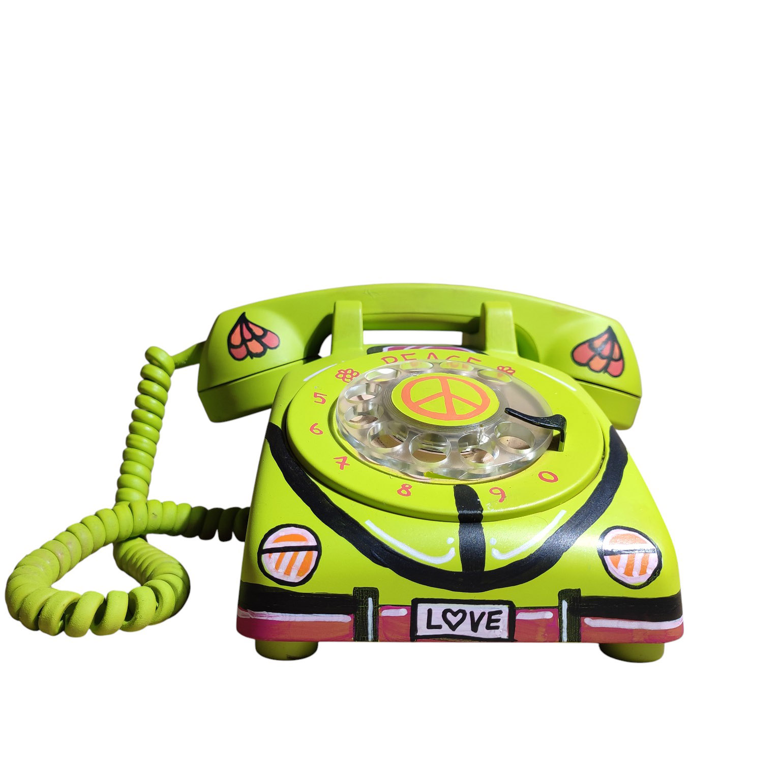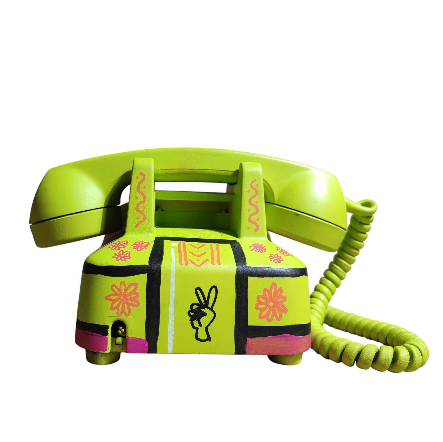 Orijinal antika çevirmeli telefon zımparalanmış, boyanmış ve çizim yapılmıştır.