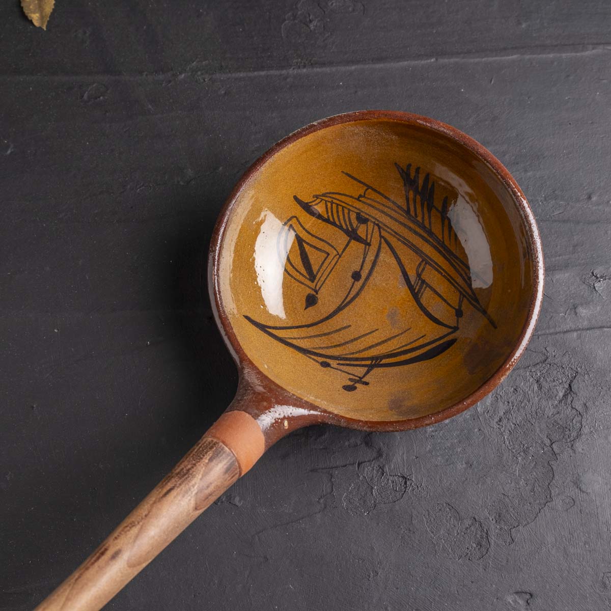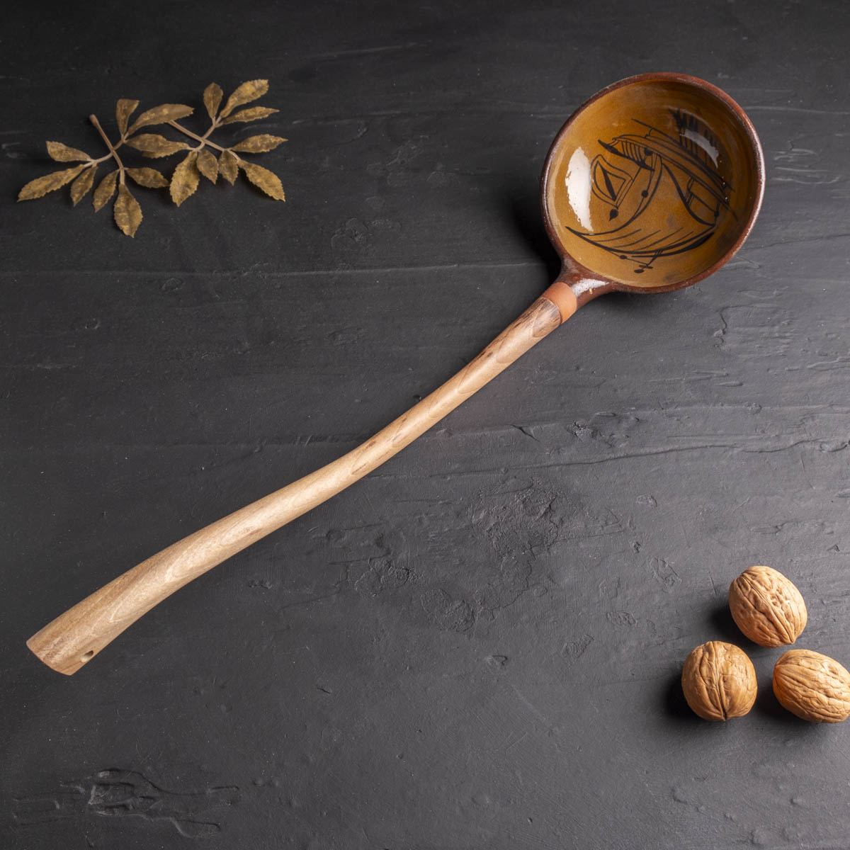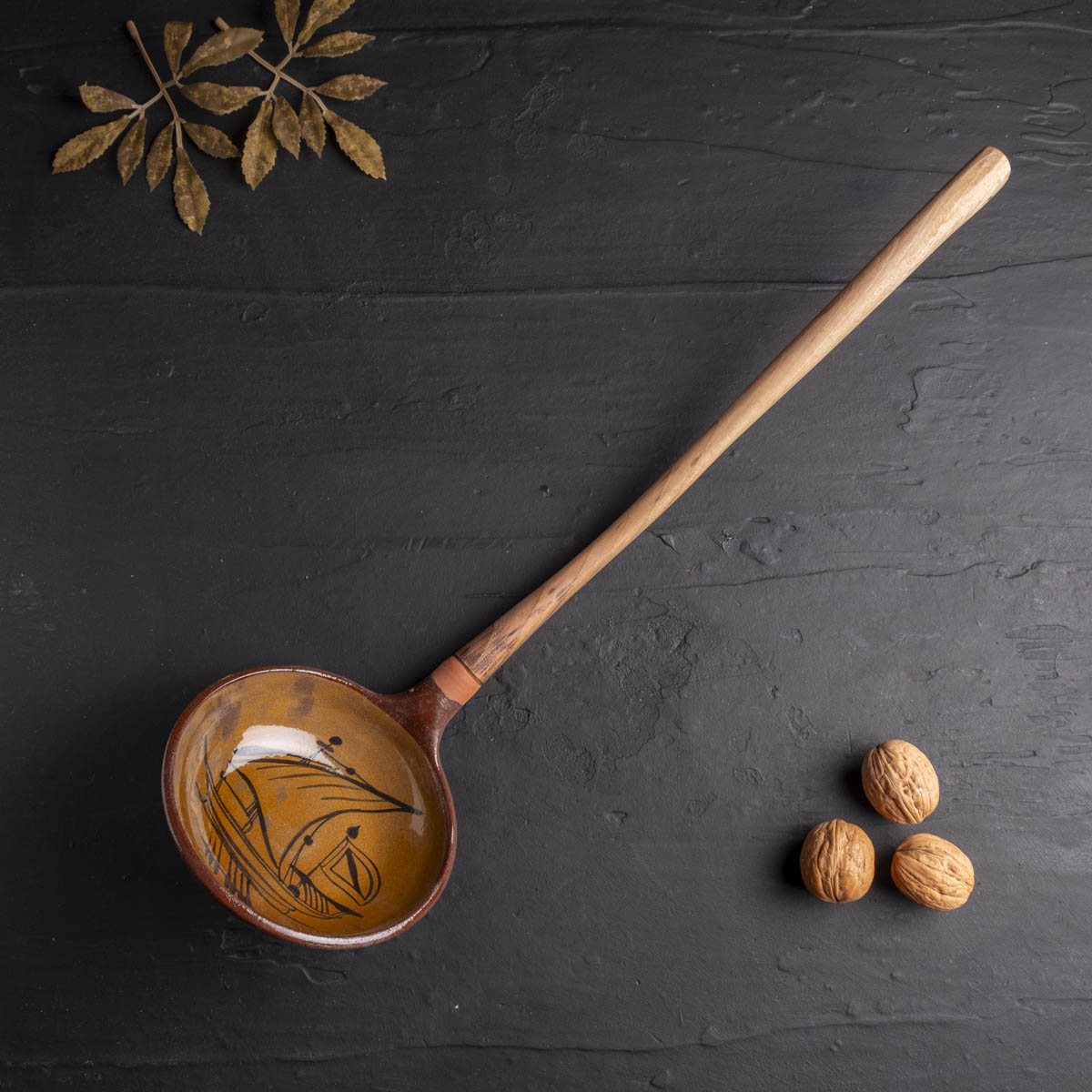 El yapımı ceviz ağacı saplı seramik kepçe.