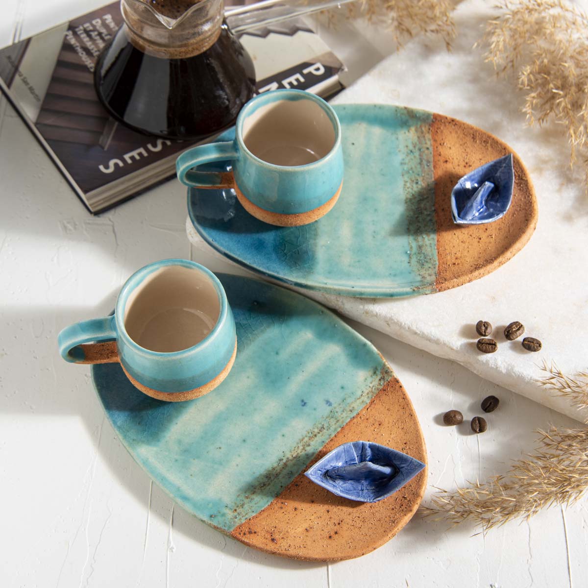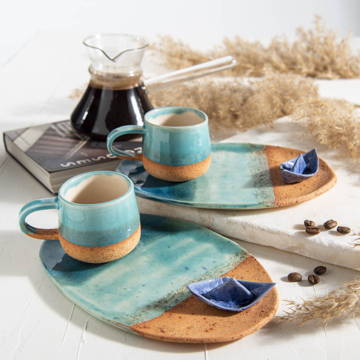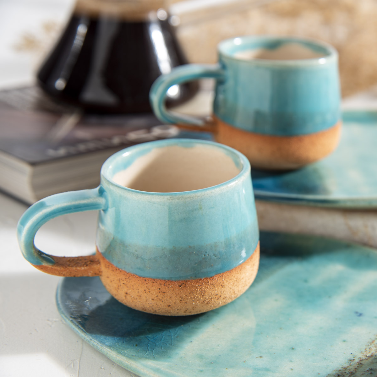El yapımı 2 seramik fincan ve 2 seramik altlıktan oluşan fincan takımı.