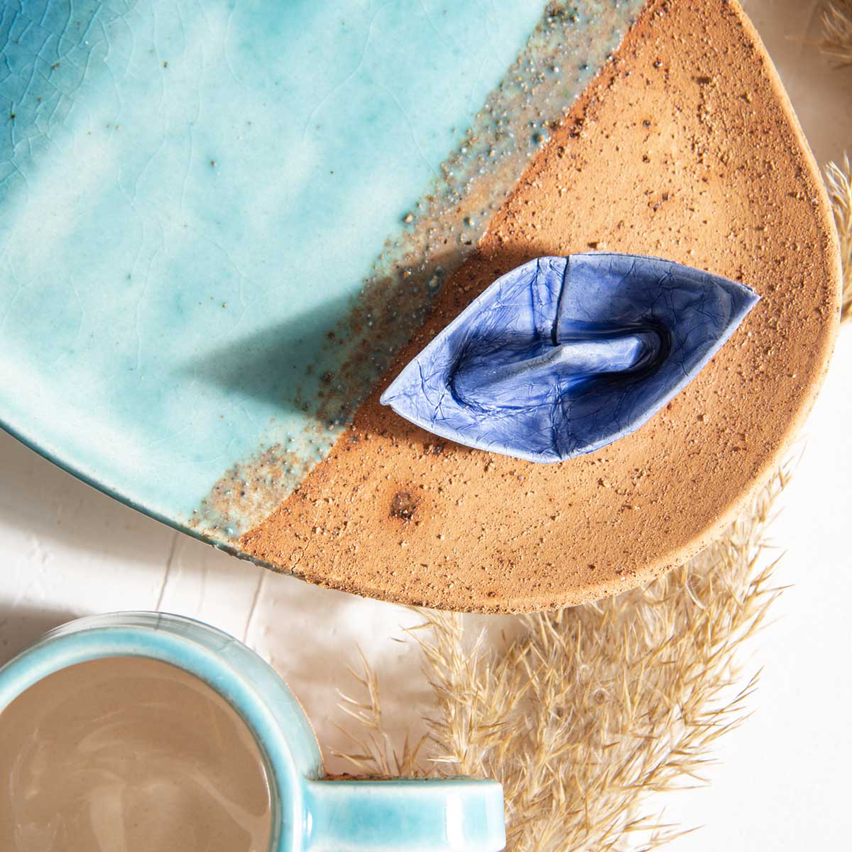 Elde şekillendirilmiş, eşsiz dokular ve renkler elde etmek için çatlayan, dağılan ve akan özel sırlarla sırlanmış ve iki kere fırınlanmıştır.