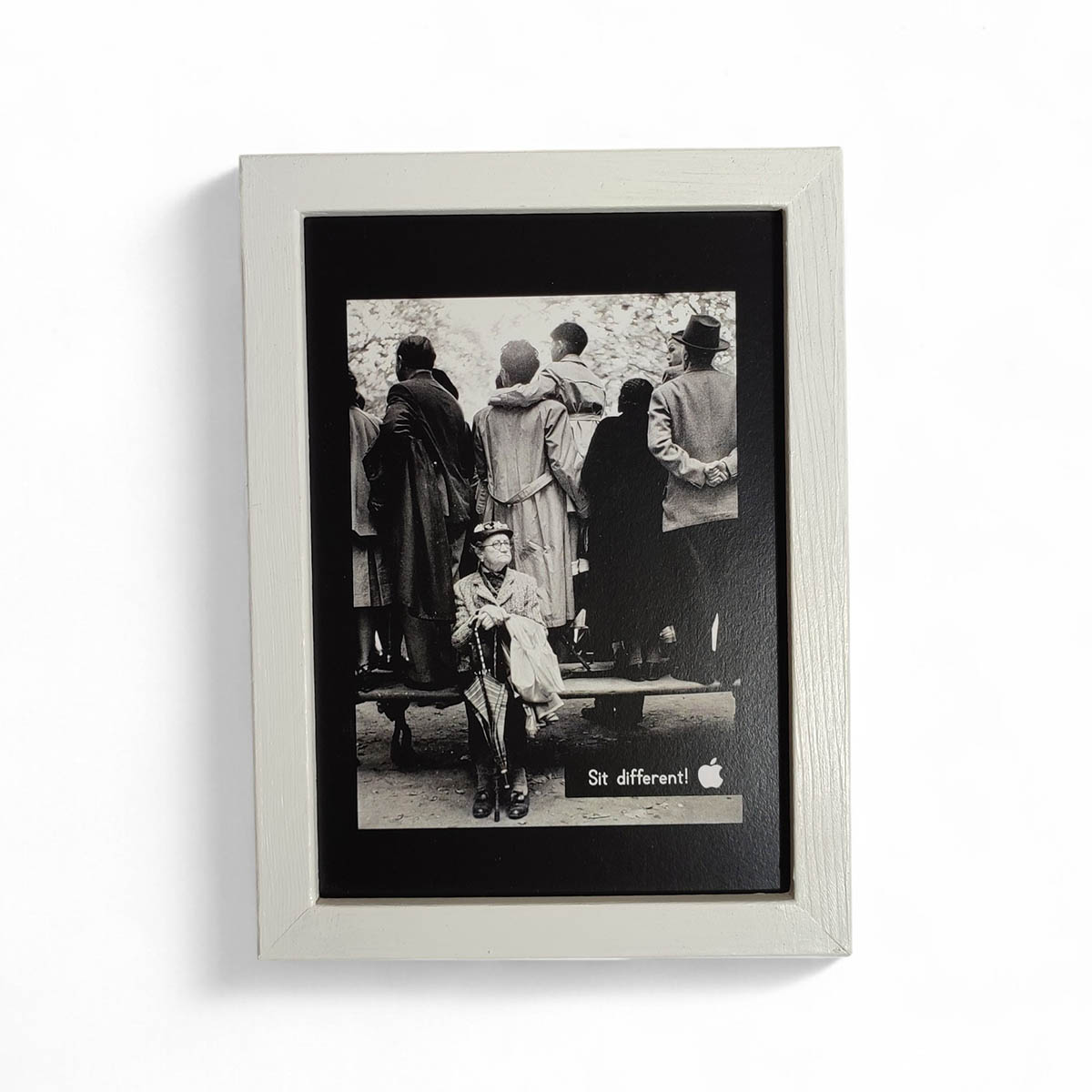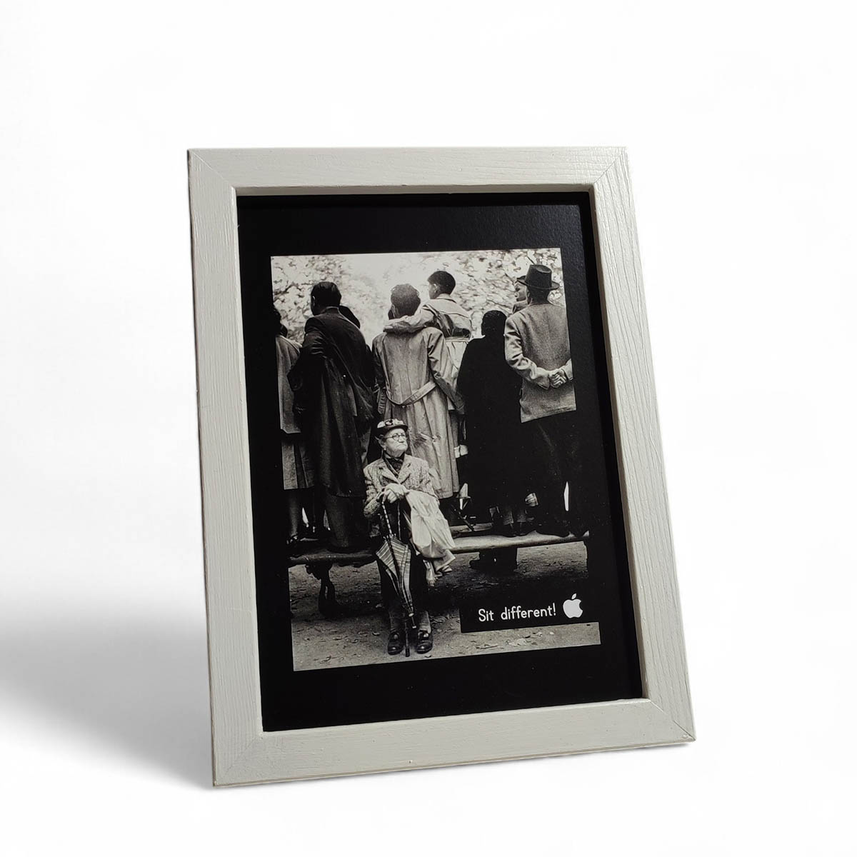 Siyah-beyaz fotoğrafın üstüne Apple’ın sloganı “Think Different”tan uyarlanarak “Sit different!” sözü yazılmış ve Apple logusu konmuştur.